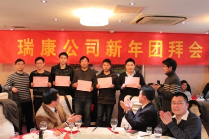 2013年1月底,公司2012年團拜聚會(huì )在南京萬(wàn)家歡酒店隆重舉行,全國各地的瑞康同仁齊聚一堂,總結了12年的工作成就,共同展望公司的美好未來(lái)。期間,表彰和嘉獎了公司表現突出的部門(mén)和員工,并頒發(fā)了2011和2012年瑞康初級工程師證書(shū)。
